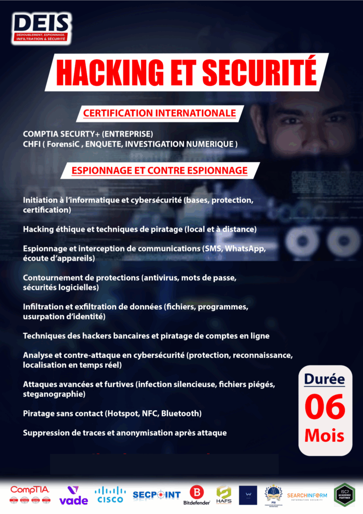 Vous apprendrez à exploiter les failles des systèmes, à analyser les méthodes des acteurs malveillants et à mettre en place des stratégies défensives efficaces. De la récupération d’informations à la neutralisation des menaces, chaque module est conçu pour vous donner une vision complète des opérations d’espionnage et de contre-espionnage.